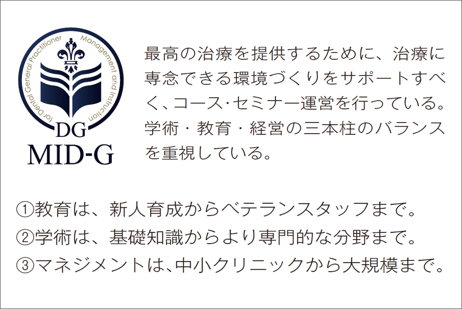 和田:私たちMID-Gは、臨床現場をとおした学術、スタッフや患者さんを含めた教育、そして歯科医療を継続していくための経営といった、「学術」「教育」「経営」この3つのバランスを非常に大切にしているグループです(図2)。