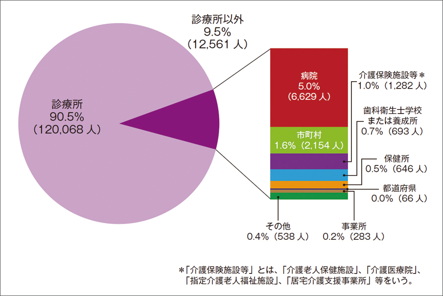 図3 就業場所別にみた就業歯科衛生士数。平成30年衛生行政報告例〔就業医療関係者〕の概況より(編集部にて一部改変・作成)。