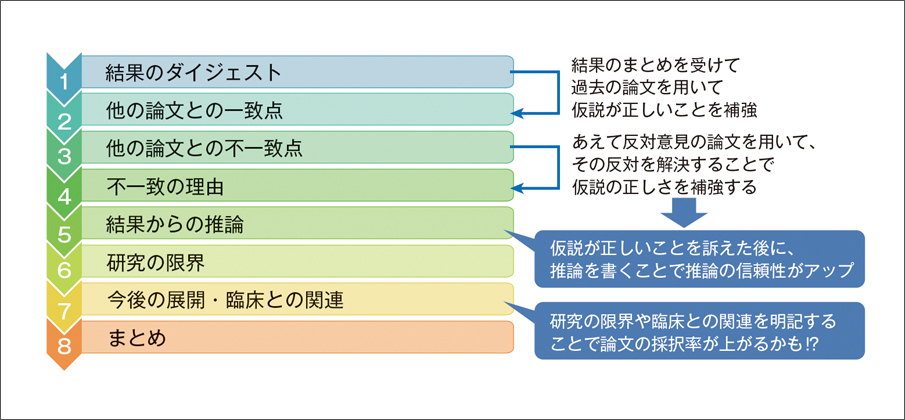 前回までで論文の7割以上が完成しました。あとは考察です。考察は自由に自分の意見や想いを書く場所ではありません。過去の論文と照らし合わせて、筋のとおった内容にする必要があるため結構たいへんです。しかし、書き方のパターンがありますので、参考にしてください。考察のパターンは、以下の1~8を順番に書いていきます(図1)。