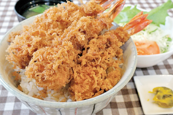 同店の看板メニューは何といっても海老丼(松)。大きなエビフライが丼に4本もそびえ立ち、そこに秘伝の醤油ベースのタレがかかっているという珠玉の一品。毎日挽いている生パン粉で包まれたエビフライは気持ち良いサクサク感。また、単品のエビフライはビールとの相性抜群です!