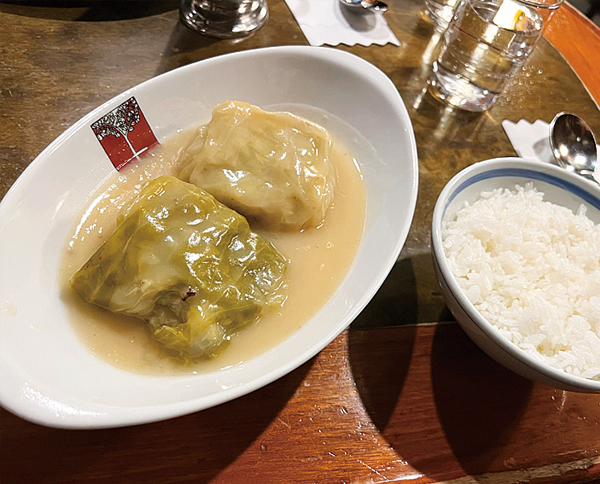 来店するほとんどのお客さんが注文するのが「ロールキャベツシチュー2貫とご飯」です。注文して5分と経たないうちに現れる深めのシチュー皿に入ったロールキャベツとお茶碗1杯のご飯はきわめてシンプル。トマト味やコンソメ味が一般的なロールキャベツですが、「当店独特料理」と謳っているアカシアでは鶏ガラベースのシチュー仕立てです。お箸で切れるほどやわらかく煮込まれたロールキャベツとお皿に満たされたやや塩気の強いシチューをスプーンですくうだけで、お茶碗1杯の白米はペロッとなくなってしまいます。